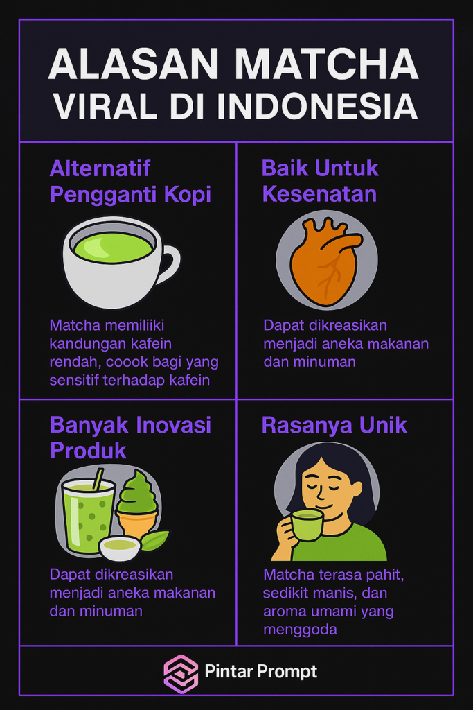 Yaps, sebenarnya hasil poster infografis yang sudah jadi dan mendekati sempurna masih dapat kamu kembangkan sesuai dengan identitas brand website, produk, logo, akun media sosial, dan sebagainya. Misalnya saja poster infografis tentang “Alasan Matcha Viral di Indonesia” dibuat identik dengan identitas brand Pintarprompt!